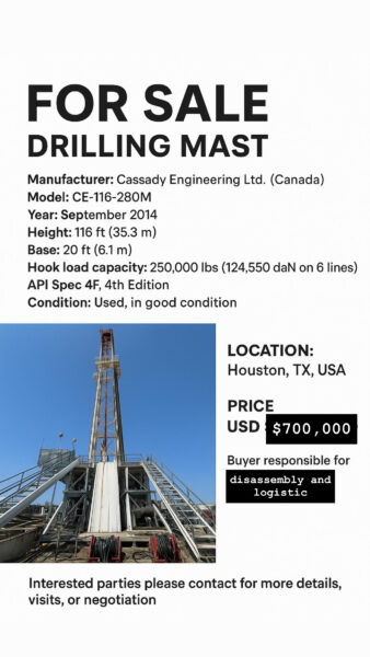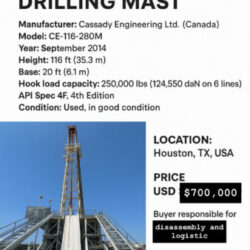 FOR SALE Cassady Engineering Drilling Mast CE-116-280M – $700,000 USD