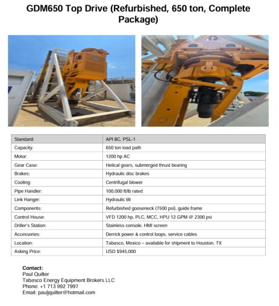 The GDM650 Top Drive is a refurbished 650-ton load path unit manufactured to API 8C PSL-1 standards. It features a 1200 hp AC motor, robust helical gear case with submerged thrust bearing, hydraulic disc brakes, centrifugal blower, and a pipe handler rated at 100,000 ft/lb. The package includes a control house (VFD, PLC, MCC, HPU), driller’s station, refurbished gooseneck (7500 psi), guide frame, and a complete set of derrick service loops and cables. Designed for reliable heavy-duty performance, the unit is offered as a complete package ready for rig integration. Located in Tabasco, Mexico, available for shipment to Houston, Texas.
